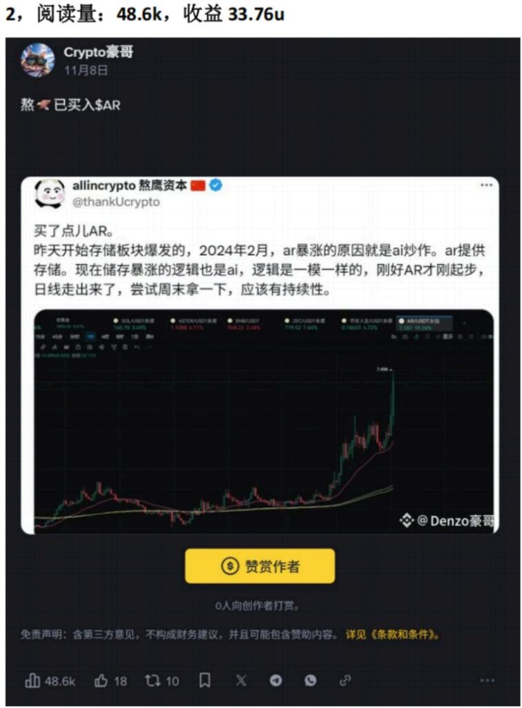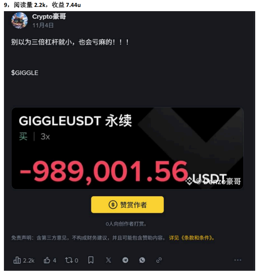 1,建议每天总结一下自己的数据情况,看看哪些做的好,哪些数据差,分析背后的原因。文案越接地气,在广场的流量越大,不要太AI+专业术语+没有感情,这种不会有什么人看另外,值得思考的一个问题是:你想在这个项目上赚多少钱?1天1美金,一个月就是30美金,一天20美金,一个月就是600美金,排行榜有人可以做到一周1000~2500美金,我的目的是一边做账号一边赚收益,两者不耽误,通过创作收益,供应自己生活费,以及项目投研,可以让我在币圈活的更久