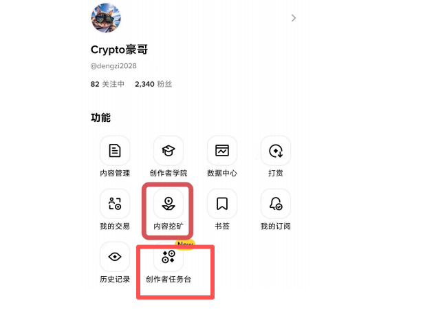 然后,点击【广场】进入个人主页,点击【内容挖矿】完成报名,这样你发帖才会有收益。