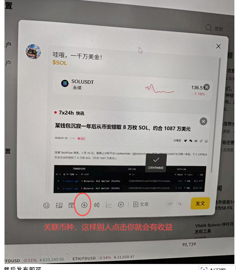 直接截图这个消息,然后发到币安广场,配一句话:大佬将这么多币转进来,是要做什么!!!然后关联币种,记得优先选永续合约的挂载,这样就算完成1条了