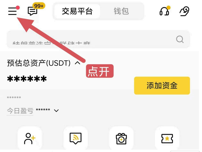 如果你是纯新人,账户里没有任何资金的,可以点首页左上角,进入个人主页,把你的币安